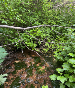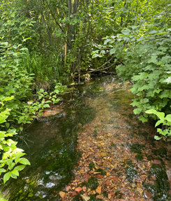 The creek itself ranges from 3-6 feet wide and a few inches to approximately 1 foot in water depth. Overburden is approximately 1 to 1.5 feet thick on most places. Fine alluvial cobbles are laid overtop of large boulders located within the deeper sedimentation layers.